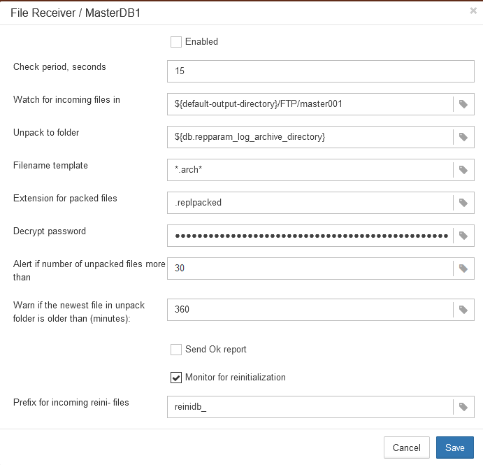 File Receiver checks files in the folder specified in «Monitor directory», with an interval equal to «Check periods, minutes». Its checks only files with specified mask (*arch* by default) and specified extension (.replpacked by default), and if it encounters such files, it decompresses and decrypts them with the password, specified in «Decrypt password», and copies to the folder, specified in «Unpack to directory».