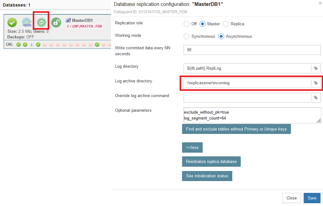 For logs stored on the replica, you need to open replication setup dialog at master server and set parameter «Log archive directory» to the local folder which is exposed as a network share, and restart Firebird to apply new settings.